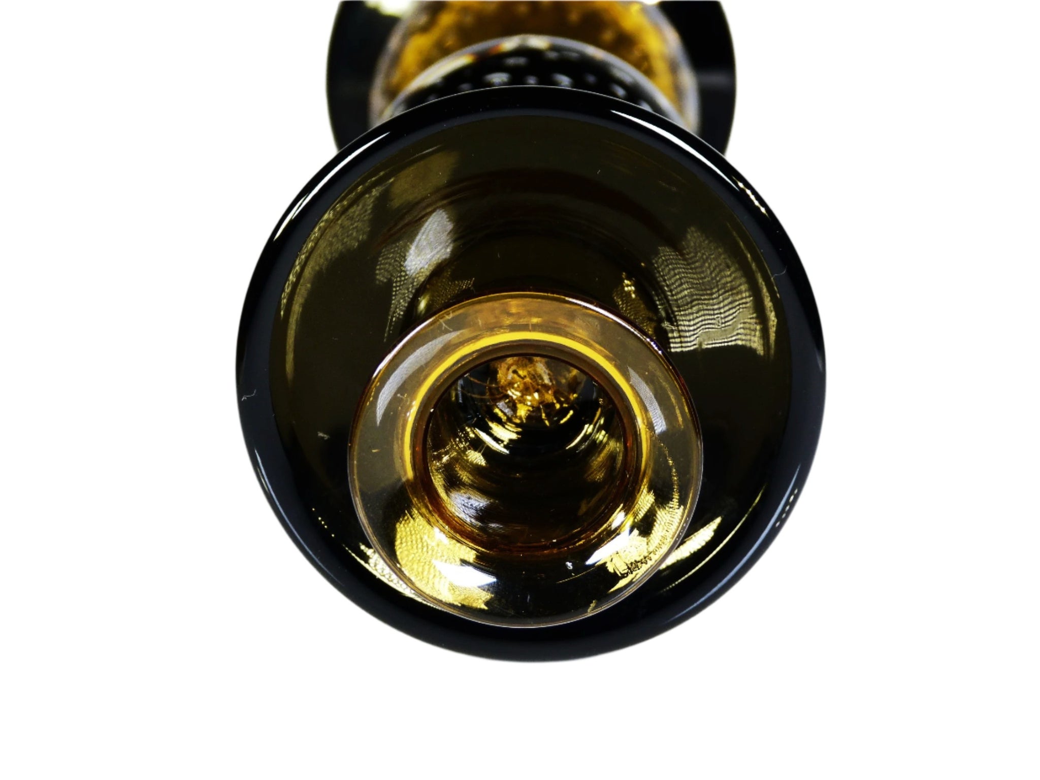 A dazzling amber and black Art Glass candlestick. This is gorgeous, the black and amber compliment each other, the control bubble areas add just the right effect, perfect for any house, old or new. The candlestick has a label, "Exibit" on the base.
