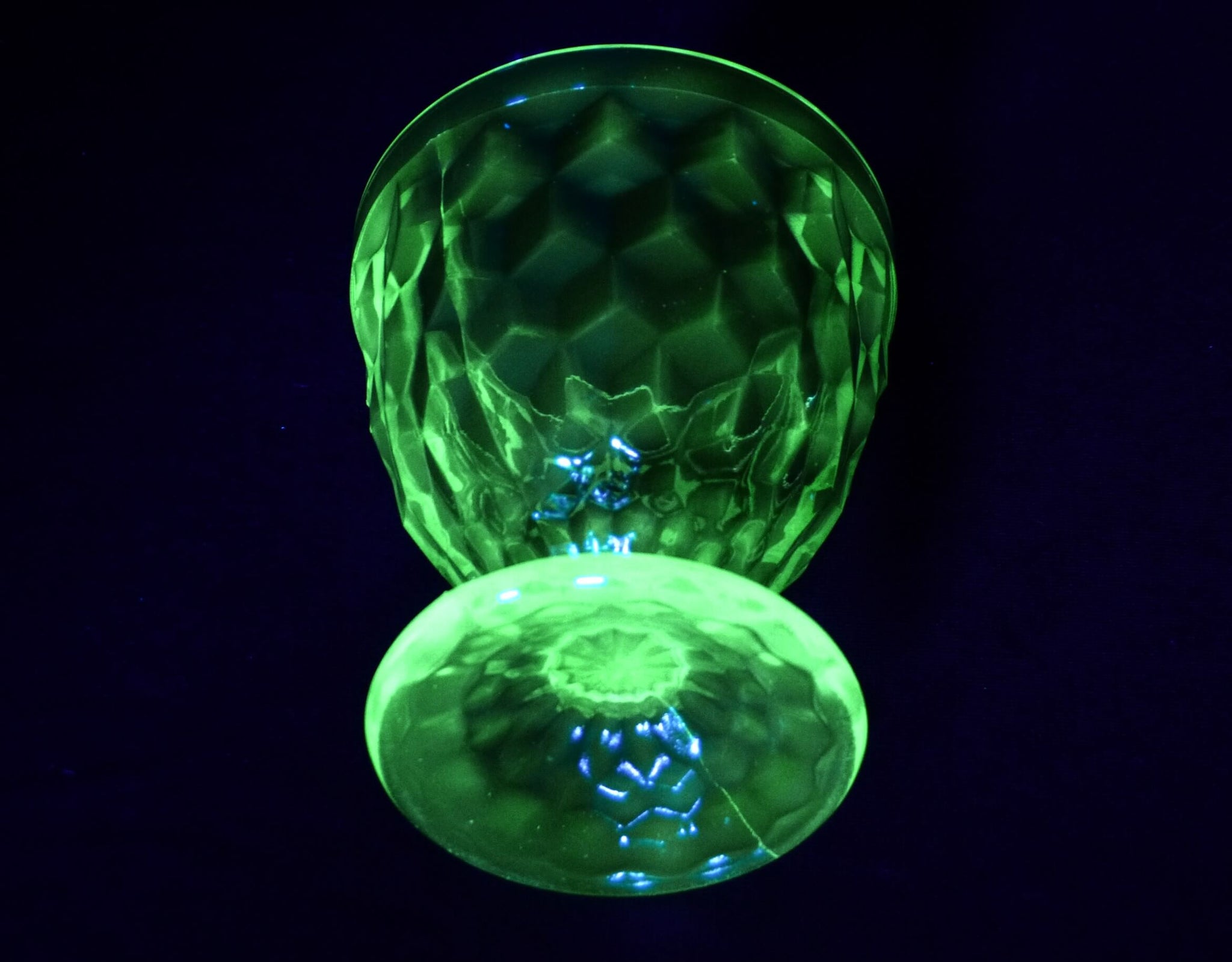 Uranium Glass Drinking Goblet, Jeannette "Cubist" Design, Glows Beautifully