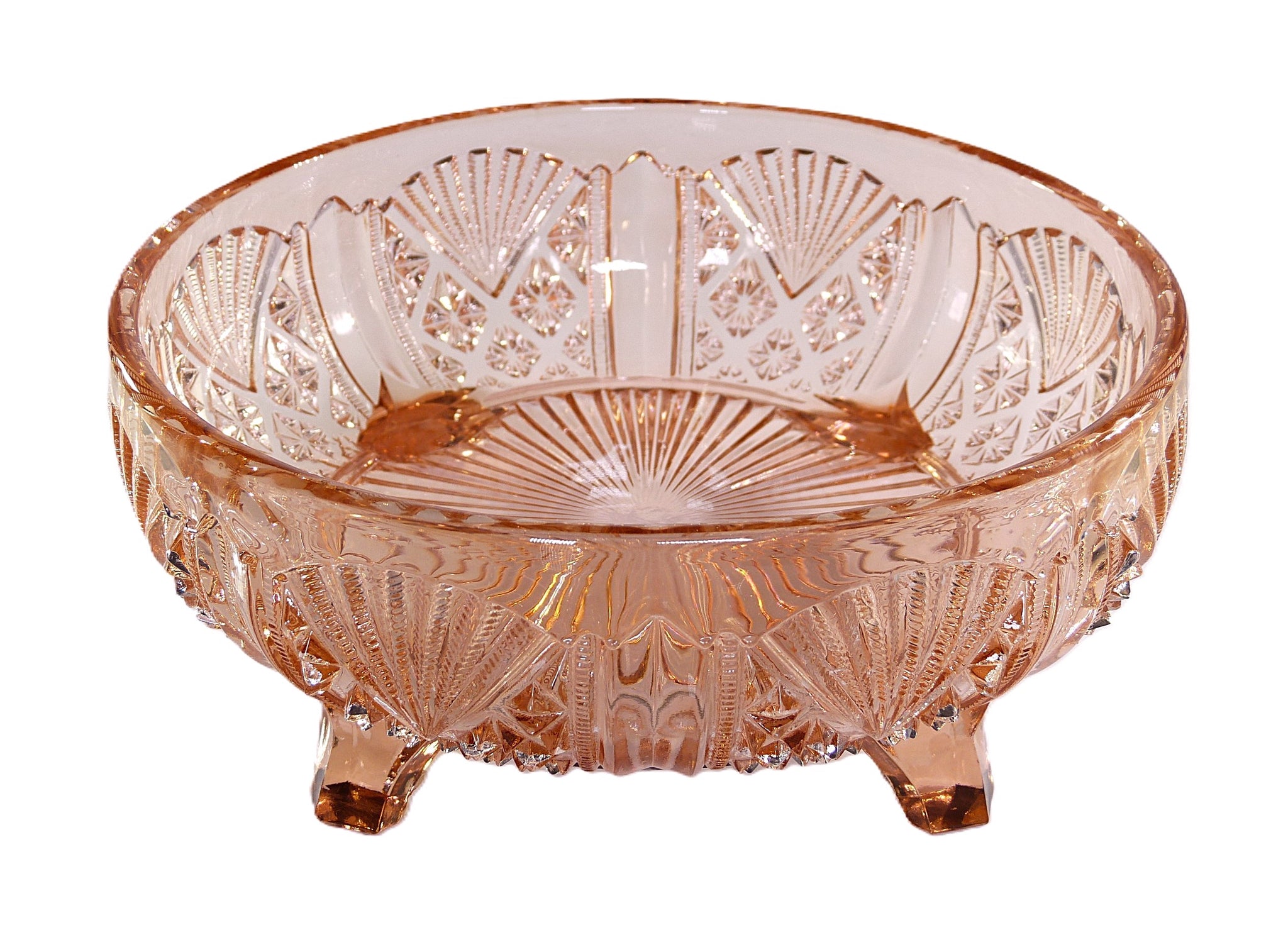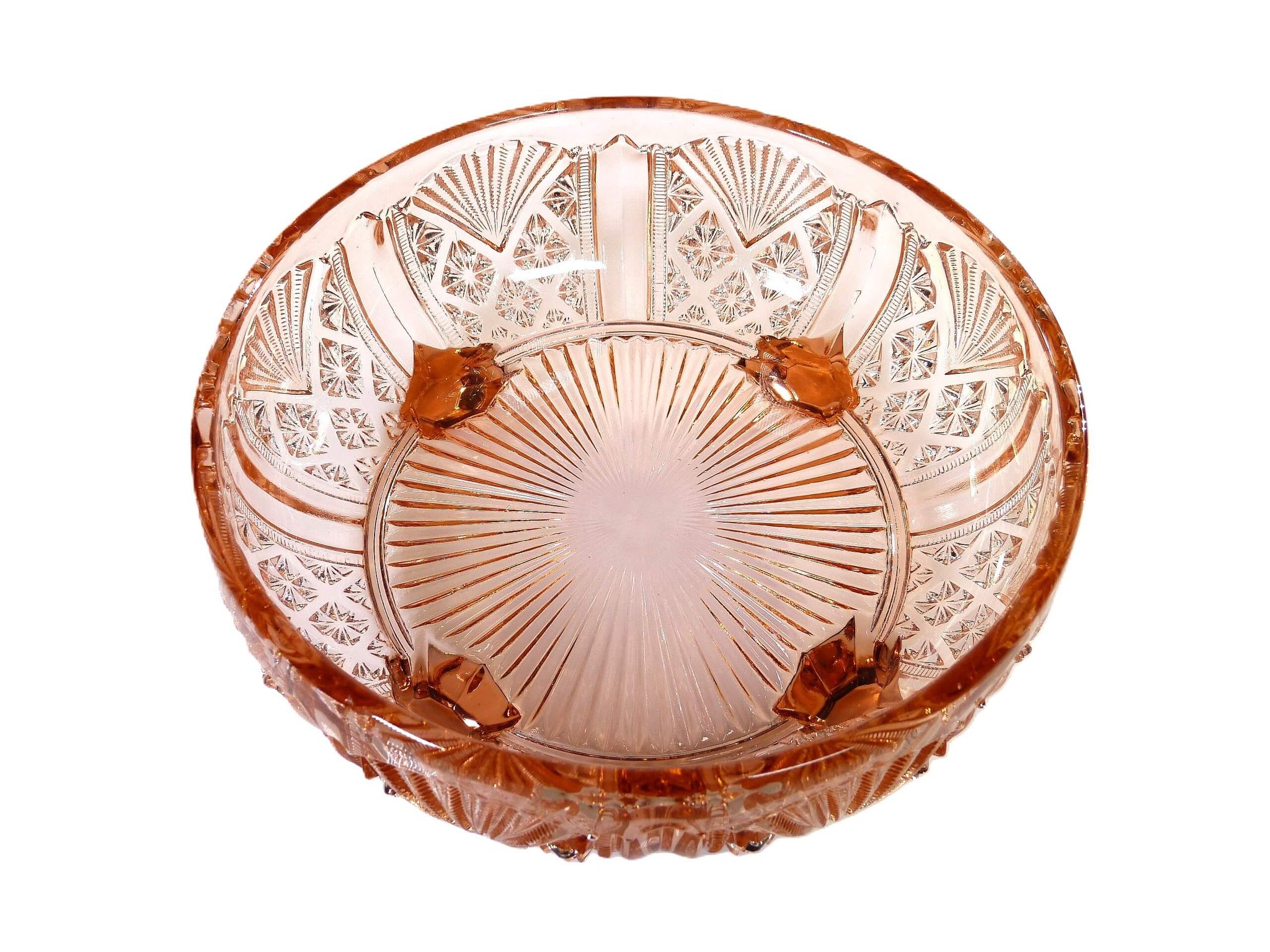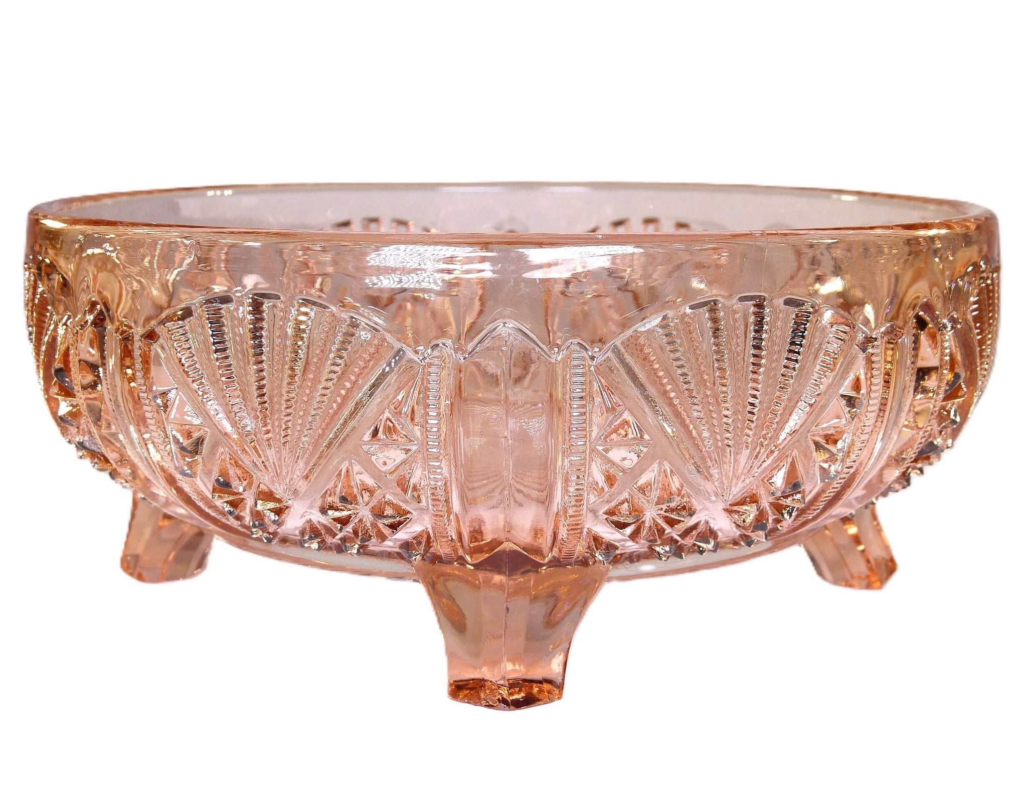 An attractive Art Deco pink pressed glass serving bowl. Made by Davidson and shown in their July 1940 Catalogue, No 718, this is a very decorative bowl. The design is an all-over pattern featuring fan shapes.