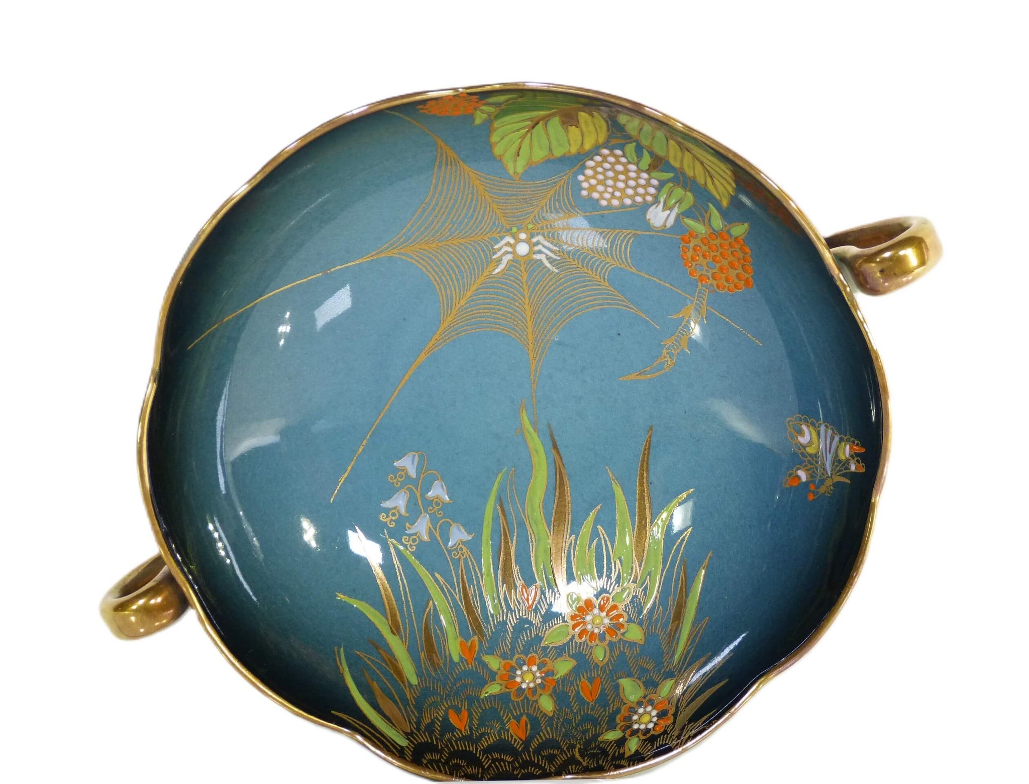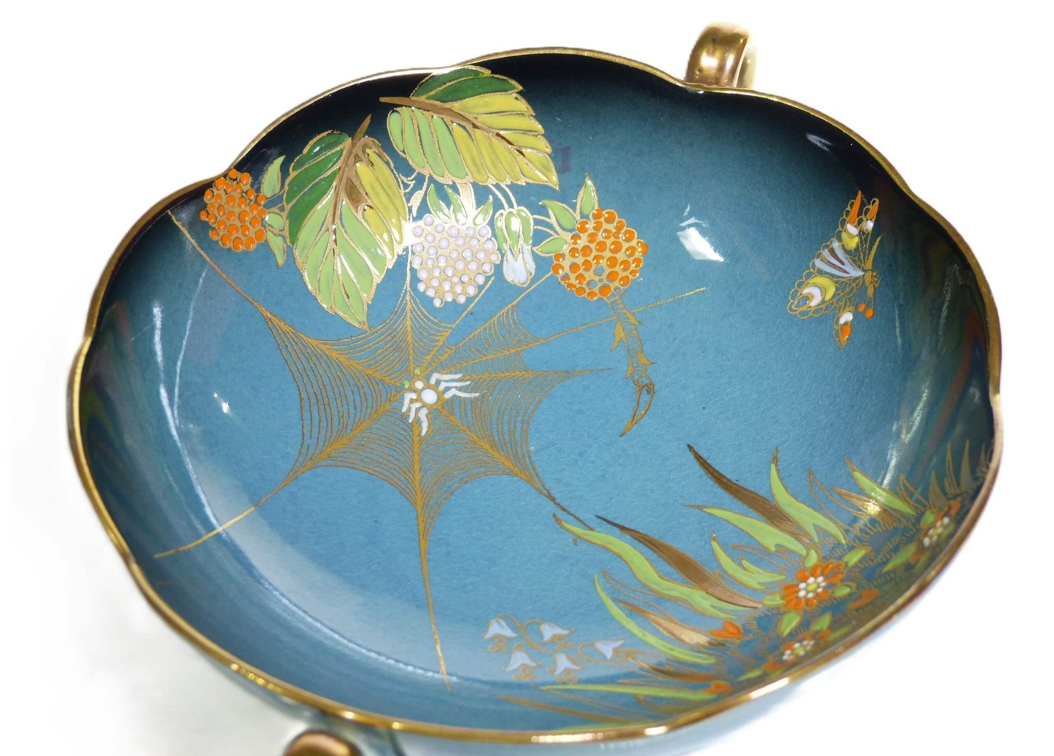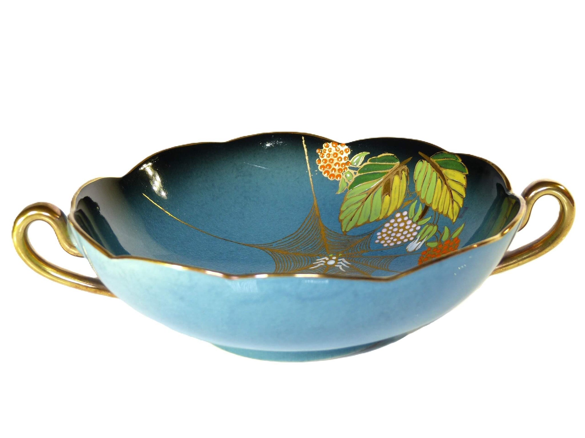 A Carlton Ware "Spiders Web" Bleu Royale, hand painted, double handled soup bowl/coupe. This bowl is a mid Bleu Royale. The base is marked Carlton Ware, Made in England, "Trade Mark" and Bleu Royale.