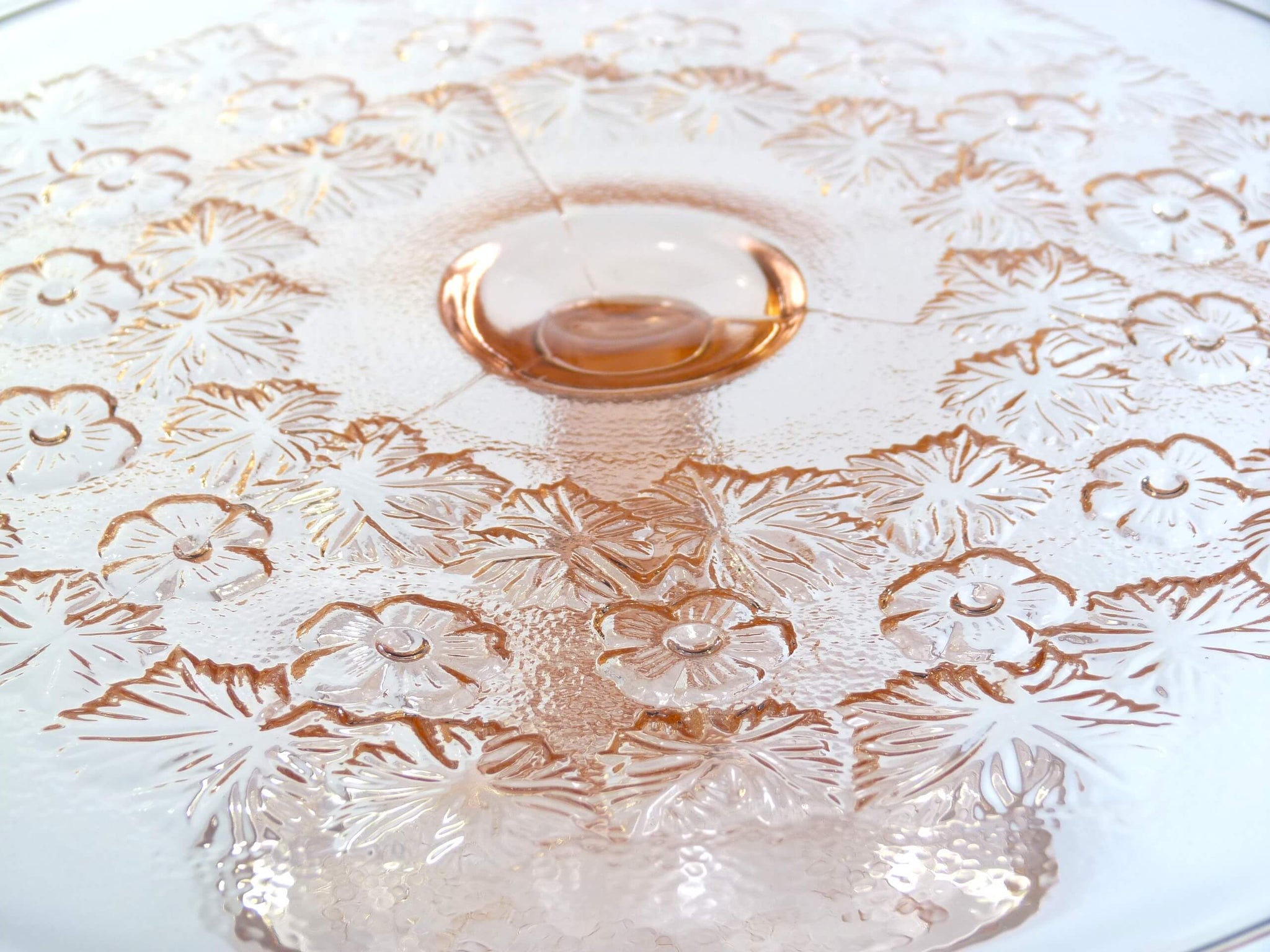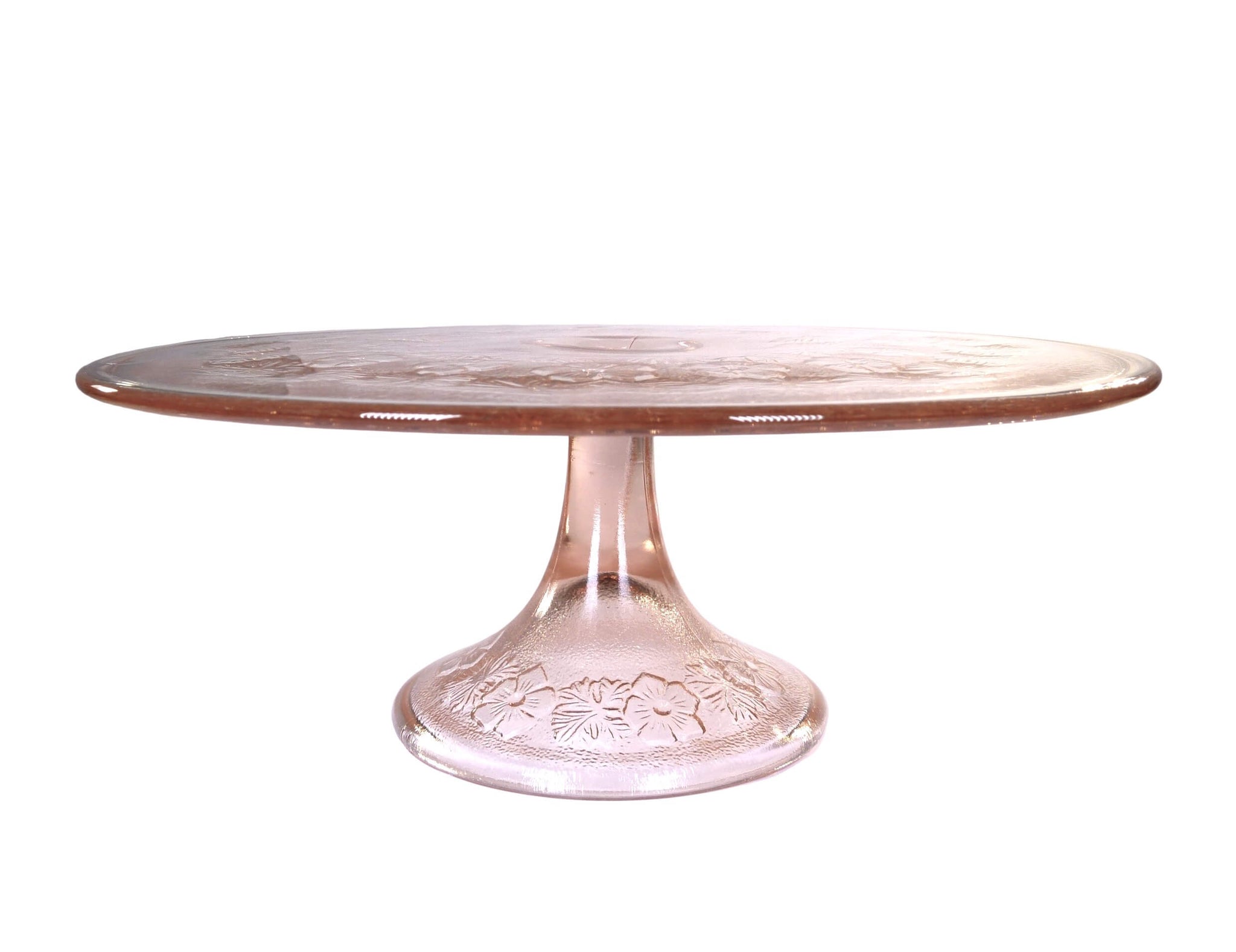 A very pretty pink pressed glass pedestal cake plate. This a lovely cake plate, a nice size and height with an attractive floral design on the plate area and pedestal base.