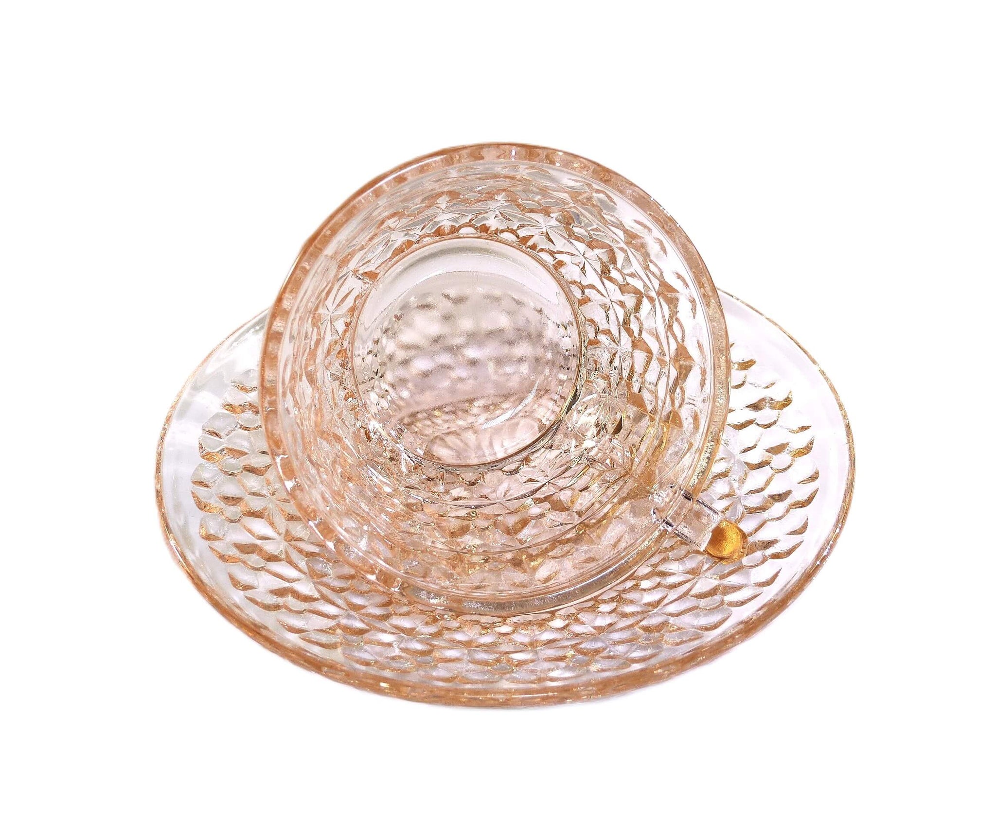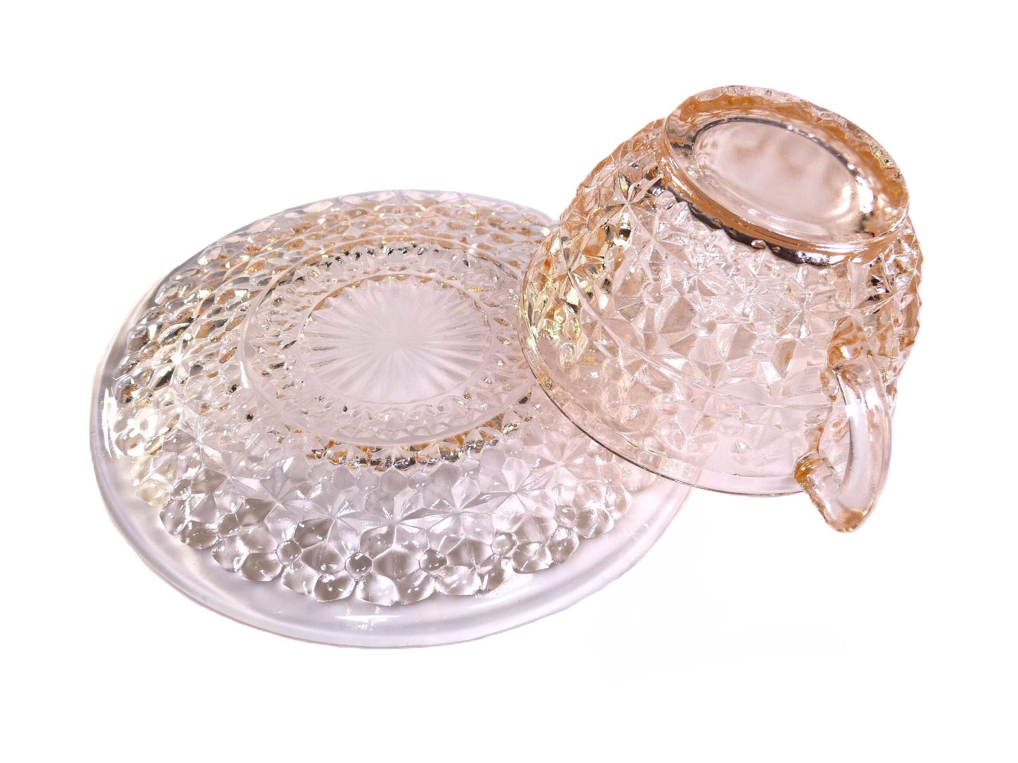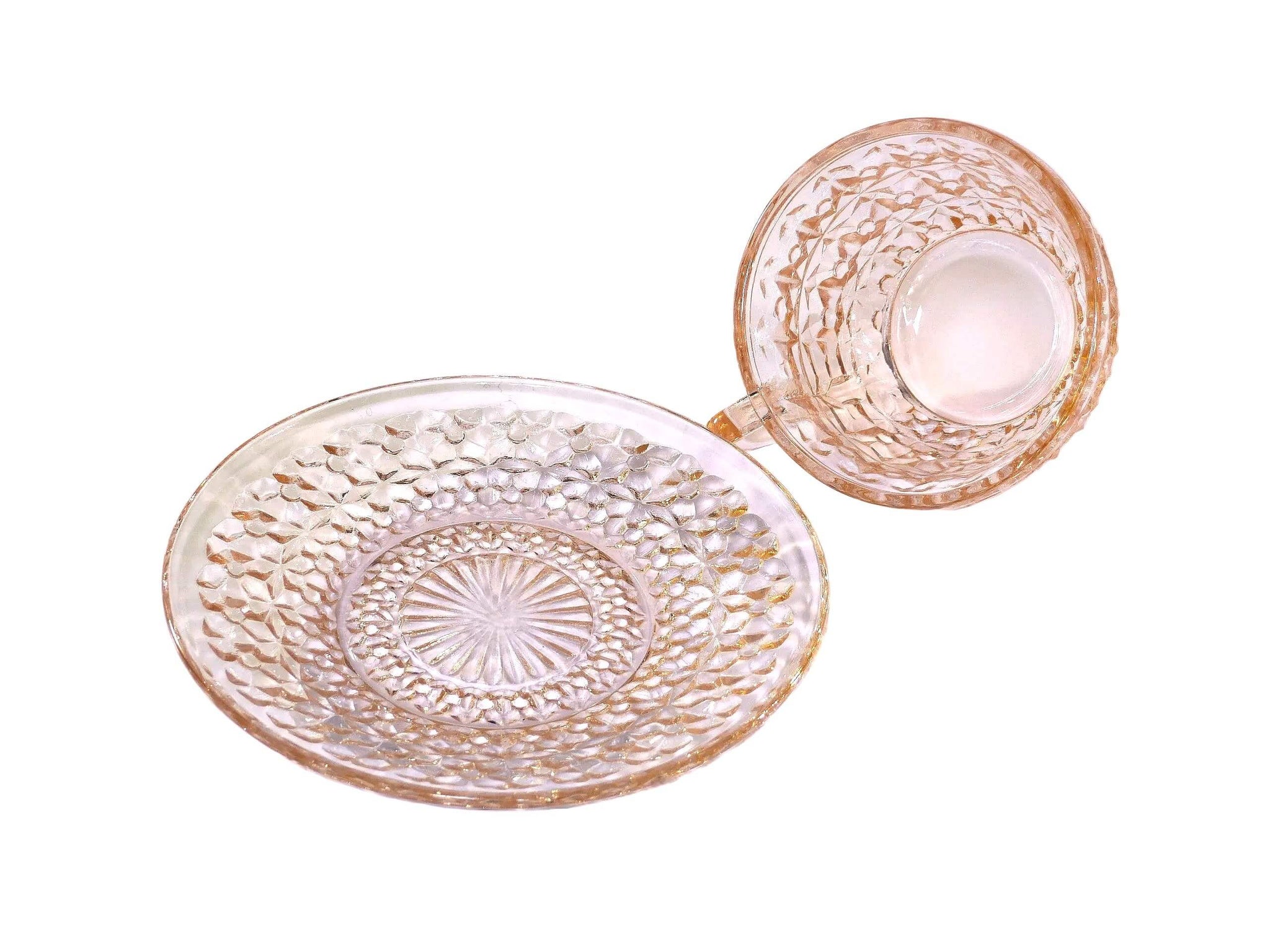 A very pretty vintage pink glass cup and saucer in the 'Button and Bows' pattern. Made by the Jeanette Glass Company, this would be a nice addition to a pink glass collection.