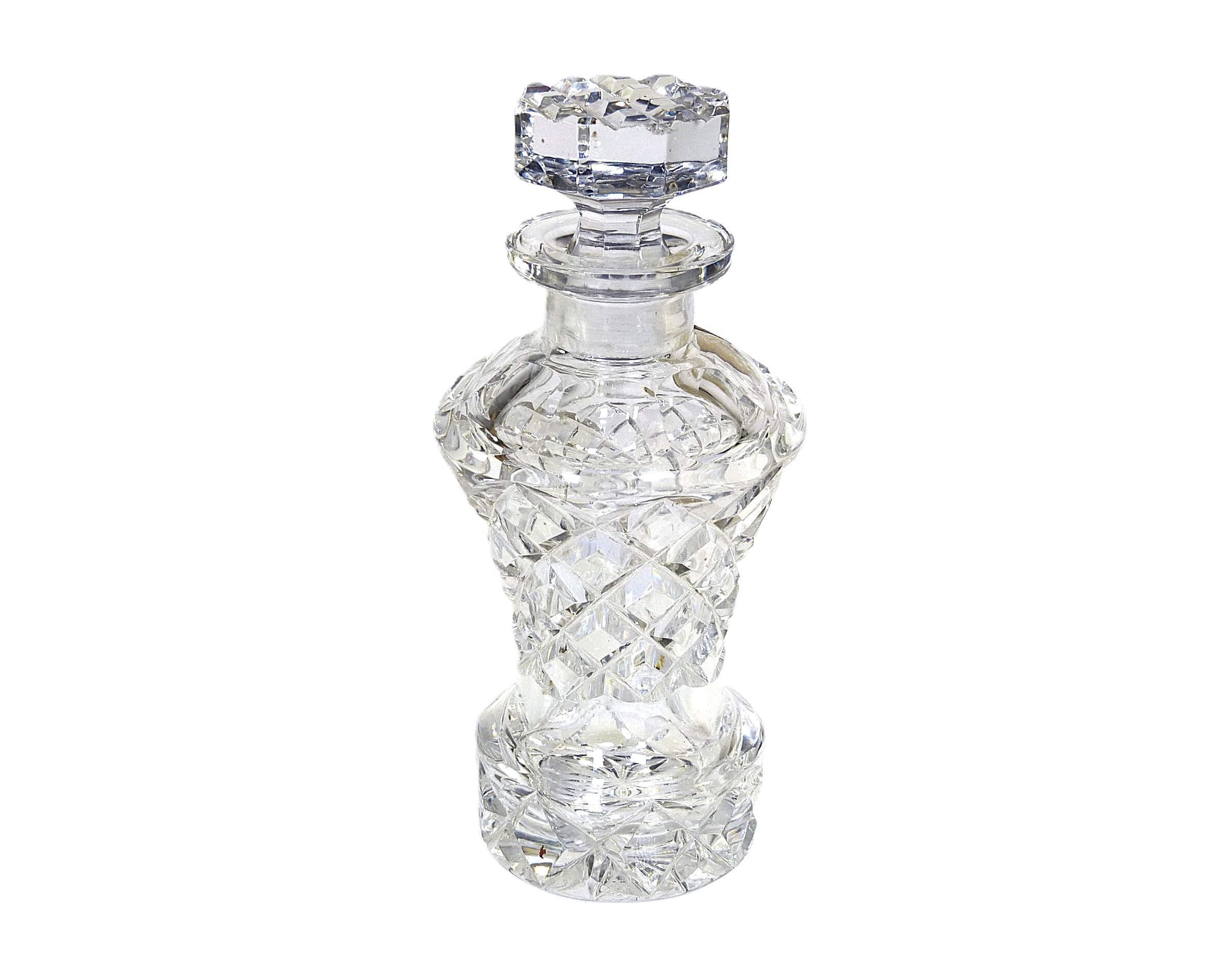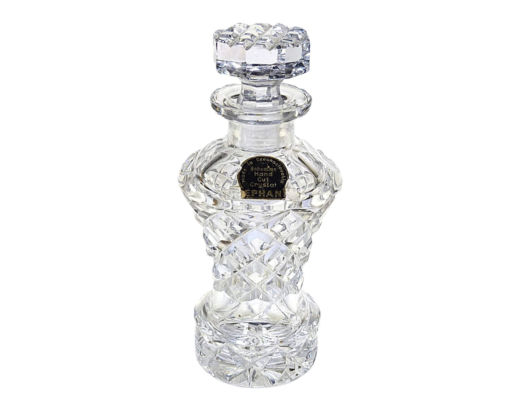 A very attractive Bohemian crystal perfume bottle. Hand cut in a diamond shape this is an impressive perfume bottle. The original label is still attached.